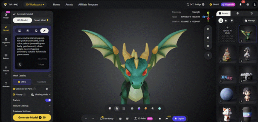 Tripo Studio allows you to generate a detailed 3D model just by typing a text description. It solves the problem of turning conceptual ideas into visual models, a task that traditionally requires hours of manual effort. With this feature, the creative process becomes faster and more intuitive, allowing you to bring ideas to life in seconds.