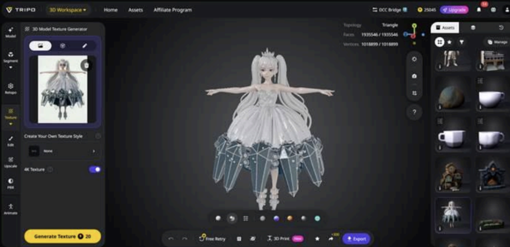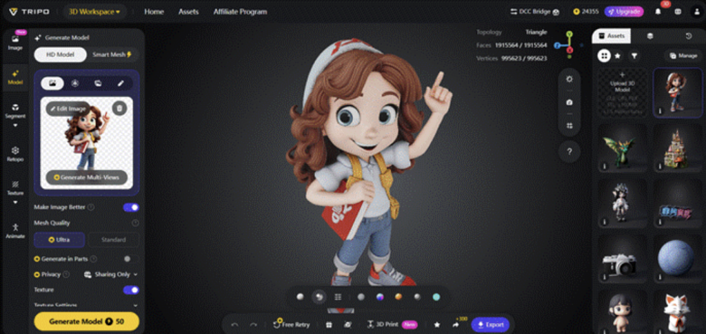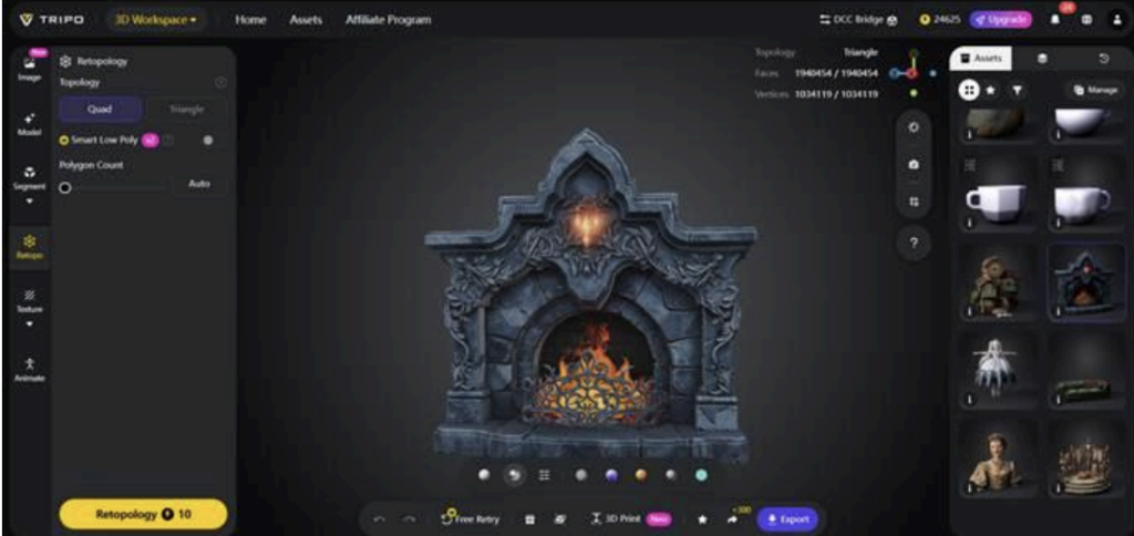 • Quality: Every model, texture, and retopology is of professional quality, thanks to the precision of AI algorithms.
