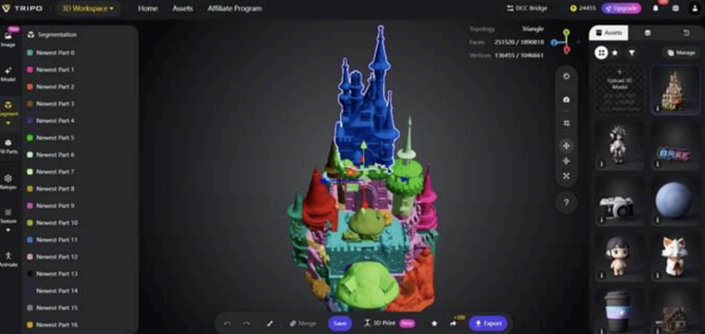 Tripo Studio’s AI-powered model segmentation allows you to automatically divide complex models into usable components. Traditionally, segmentation is a time-consuming process that requires intricate knowledge of modeling tools. By automating this step, Tripo Studio streamlines the creation process and enhances the flexibility of your models.