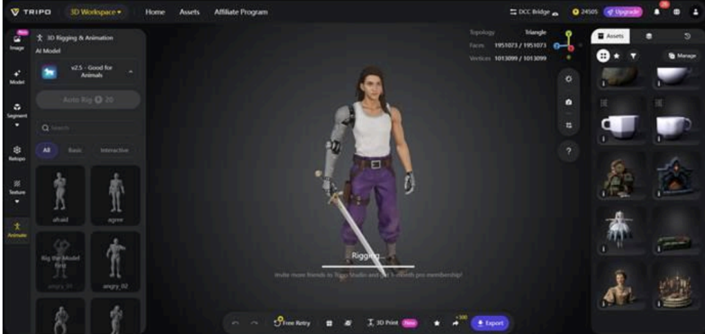 Tripo Studio’s auto-rigging feature fine-tunes the proportions and details of your models to ensure consistency and visual harmony. Adjusting the range and detail of 3D models manually can be tedious, but this feature lets you focus on the bigger picture while the AI takes care of the rest. The result is smoother, more polished models ready for rendering, printing, or integration into a project.