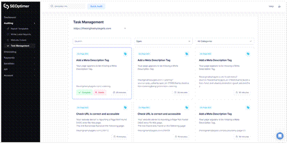 If the audit highlights areas for improvement, the results can be turned into an actionable plan using an SEO task management tool. An SEO task manager shows you which tasks are most important and helps users track critical SEO fixes, such as layout or readability issues.